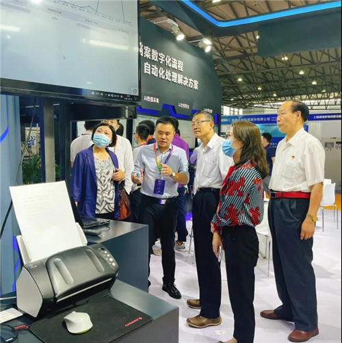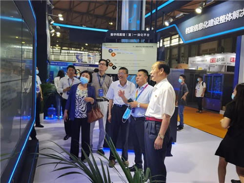 立鼎副總裁熊春明向原國家檔案局局長(cháng)楊冬權以及現場(chǎng)觀(guān)展來(lái)賓講解